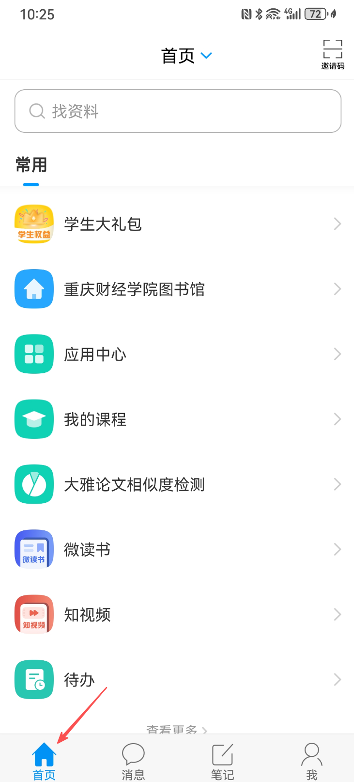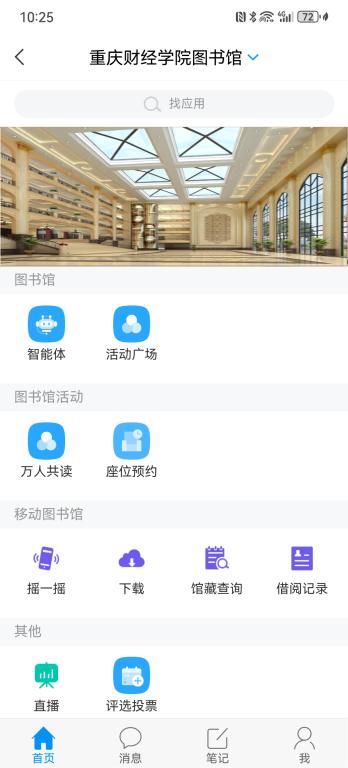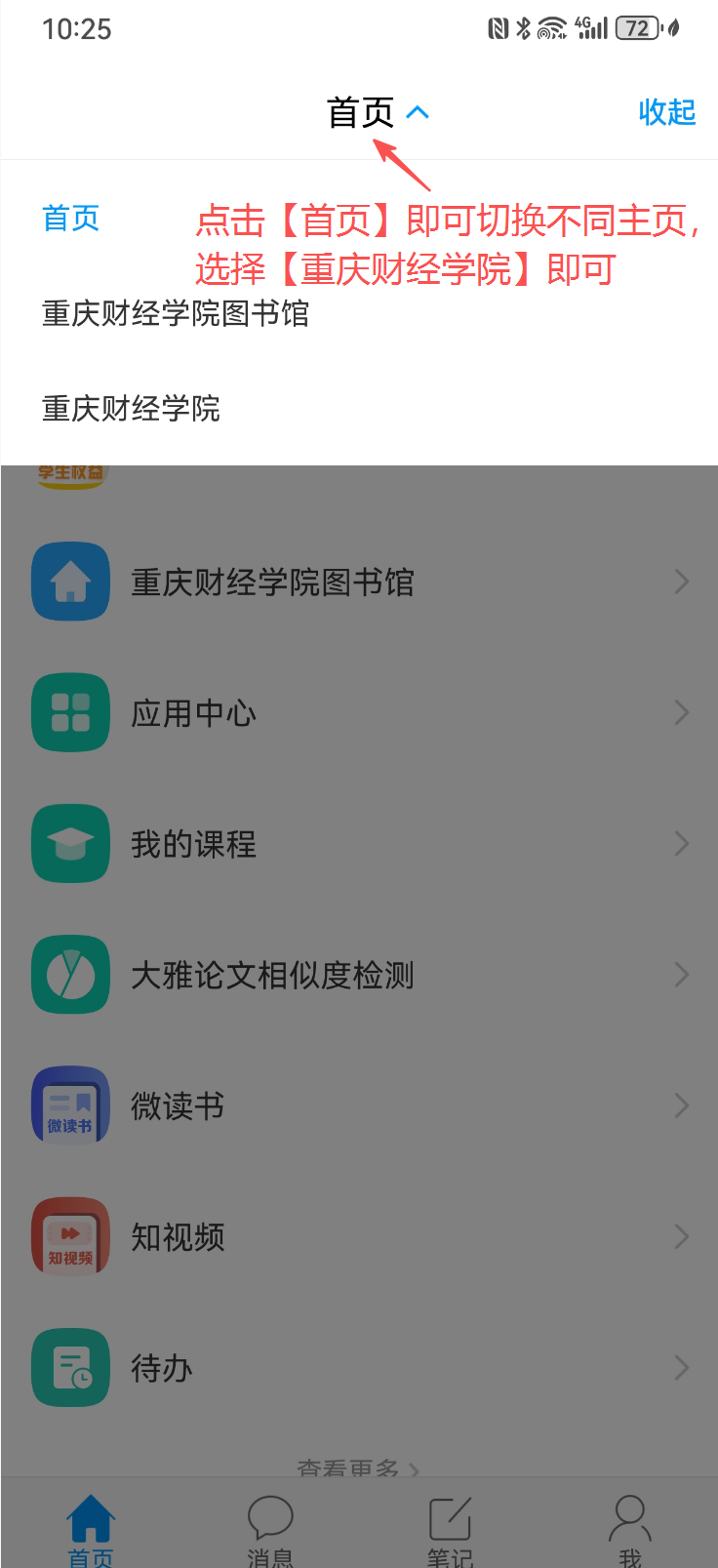 登录成功后,返回“学习通”APP首页→点击顶端中央[首页]→右边[三角形]图标→显示所有认证过的单位。从中选择“重庆财经学院图书馆”,即可进入该图书馆的专属界面。