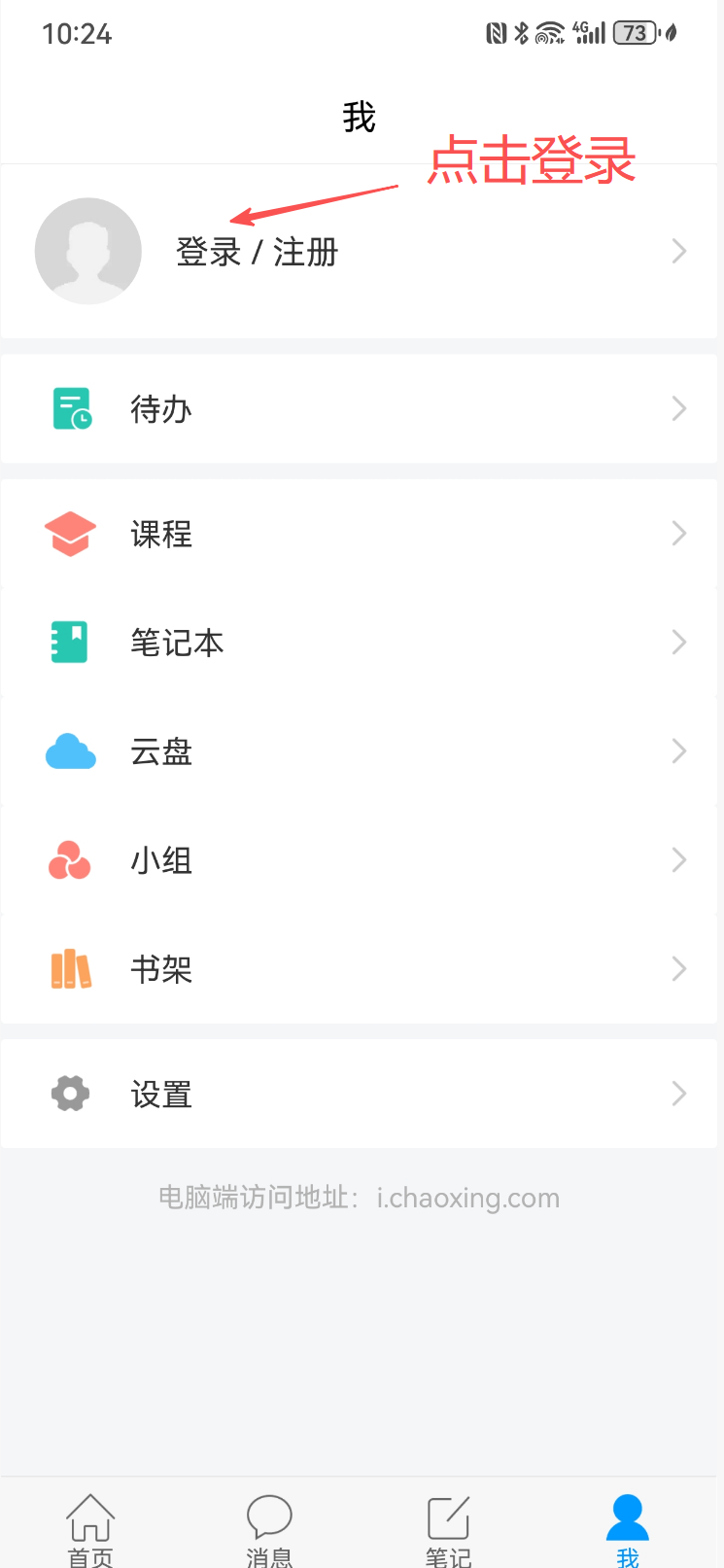 打开学习通APP→点击右下角[我]的图标→选择[设置]→[退出登录]界面。