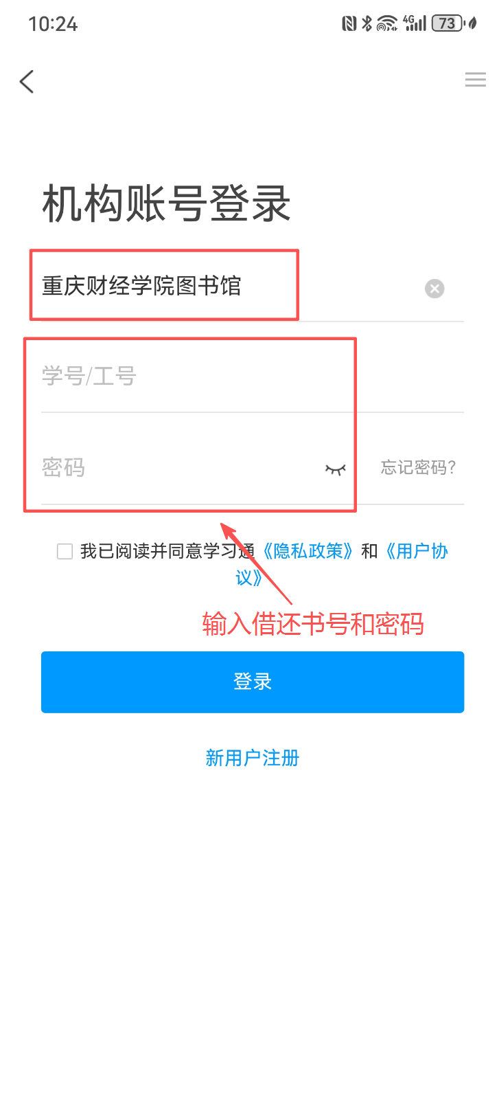 打开“学习通”APP,进入登陆页面,→选择新用户注册→输入手机号码→单位名称[重庆财经学院图书馆]→选择[跳过]→即可完成注册。
