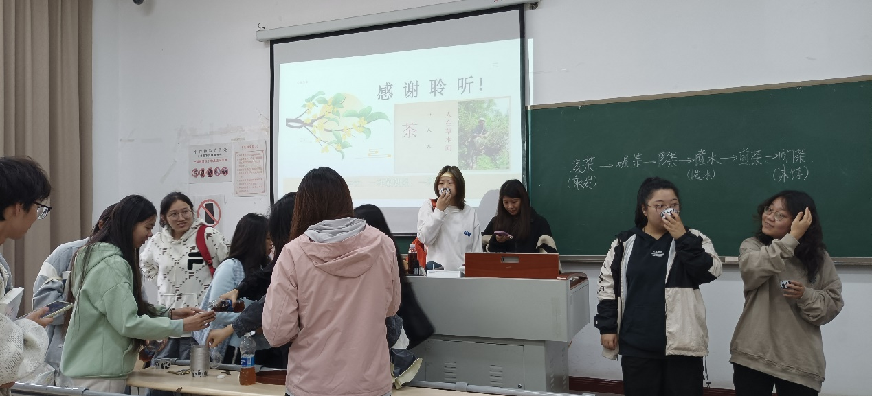 首先,田翰林老师用短视介绍《茶经》(中国第一部系统阐述茶文化的专著)的作者陆羽和2022年11月29日 “中国传统制茶技艺及其相关习俗”成功申请非物质文化遗产,视觉冲击让大家对中国传统茶文化敬畏和自信油然而生。其次,田翰灵老师带领大家逐句精读原文,结合古籍注释与现代实践,详解“薪火之选”“候汤之法”二大核心要点:“其火用炭,次用劲薪”的燃料讲究,再到“其沸,如鱼目,微有声,为一沸;缘边如涌泉连珠,为二沸;腾波鼓浪,为三沸”的候汤精髓以及唐代煎茶六步:炙茶——碾茶——罗茶——煮水——煎茶——酌茶,让在场师生领悟到五之煮中“顺应自然、精益求精”的理念。最后介绍了煮茶现代的传承与发展。