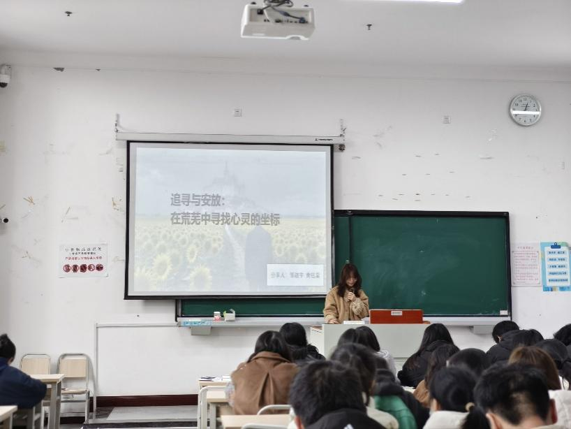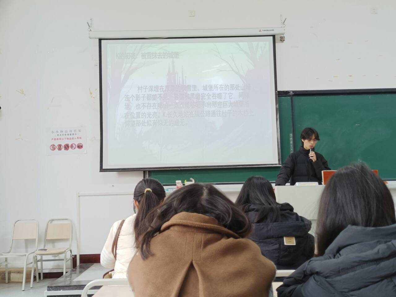 黄钰棠则聚焦《城堡》的荒诞内核,以"向上求索:在迷途中执着前行"为切入点,深入剖析"迷雾之境"的双重象征意义。在总结发言中,黄钰棠提炼出四重精神收获:直面生命有限性的勇气、在效率社会中守护温度的智慧、在务实与理想间寻求平衡的智慧、通过阅读实现自我观照的成长价值。寸家菊老师对活动给予高度评价,认为这种"学生自主承办+图书馆支持"的模式,充分展现了重财学子的阅读深度与团队协作力,是书香校园建设的生动实践。