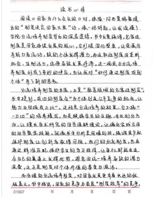 本次大赛自11月18日正式启动以来,迅速点燃全校学子的参与热情,充分彰显了活动的广泛影响力。参赛同学以笔为媒、以思为魂,将对书籍的深度理解、独到见解与真挚感悟凝注于字里行间。为确保评选过程公平、公正、公开,经济学院专门组建了由学生会主席张盼、学纪部负责人及核心工作人员组成的评审团队,围绕内容完整性、思想深刻性、创意表现力、书写规范性四大维度展开细致评审,历经初筛、复评、终评三个阶段的层层遴选,最终评选出一等奖2名、二等奖4名、三等奖 7名。图书馆现将优秀部分读书笔记予以展出。