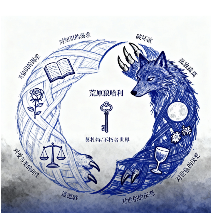 该作以环形构图解析哈利内心:左侧书本、玫瑰、天平对应他人性里的求知、向美与道德;右侧狼形、“炼狱” 承载其狼性的破坏欲与厌世;中间钥匙与“莫扎特 / 不朽者世界” 指向冲突的整合,用视觉符号让抽象精神困境直观落地。
