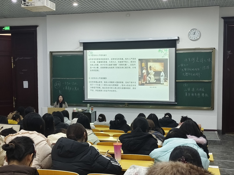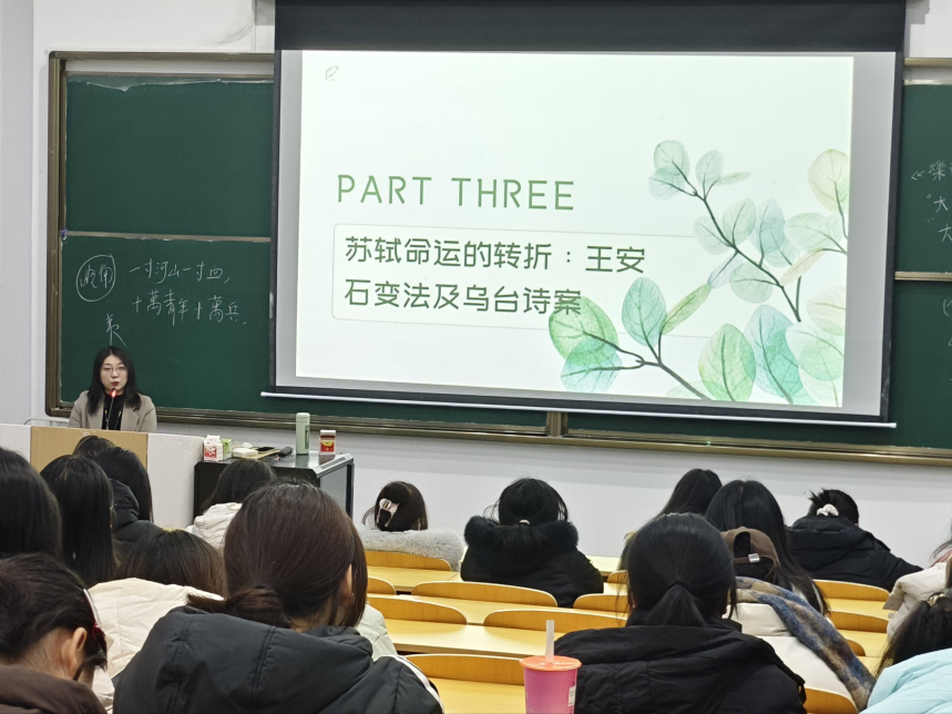 诗词是中华文脉的鲜活载体,是跨越千年的心灵对话。为传承古典诗词之美,感悟士大夫精神内核,12月17日中午,“诗词大讲堂之永远的苏东坡” 主题讲座在 1126 阶梯教室如期举行。本次讲座由擅长中华优秀传统文化、心理学、教育学等领域进行跨学科教学与研究的博士、副教授贺双艳主讲,图书馆寸家菊老师及全校210余名学生参加。