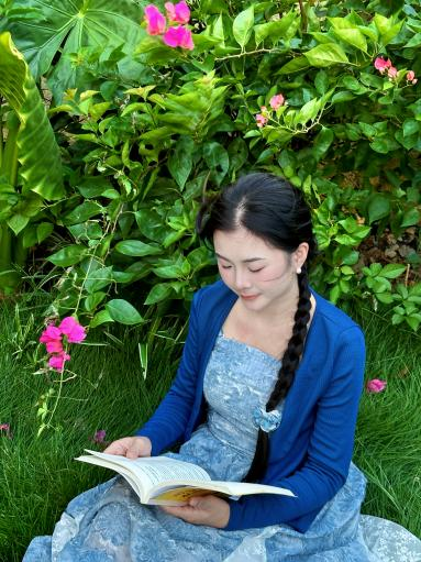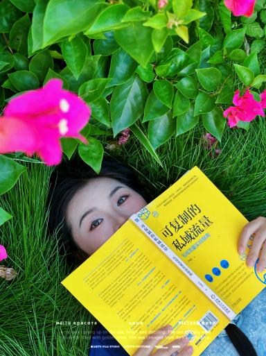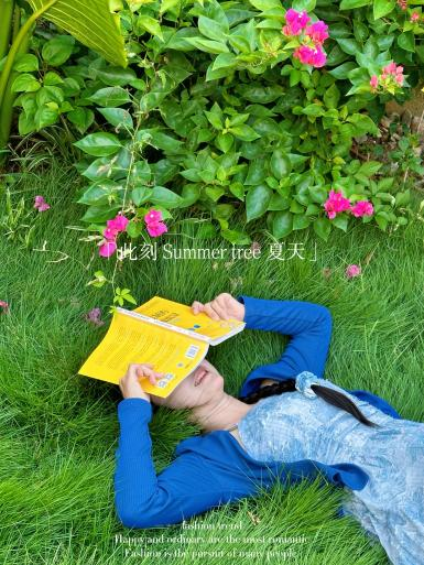 这次拍摄选了草丛和散落的花瓣做背景,技巧上用了自然光线+低角度构图:借树荫柔化光线避免过曝,低角度视角让花草自然环绕人物,营造沉浸式氛围。创新点是“书的互动”——从阅读到用书遮脸、半遮镜头,既保留松弛感,又让静态画面多了动态趣味,把日常场景拍出了文艺松弛的层次。