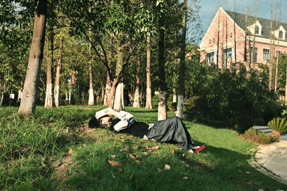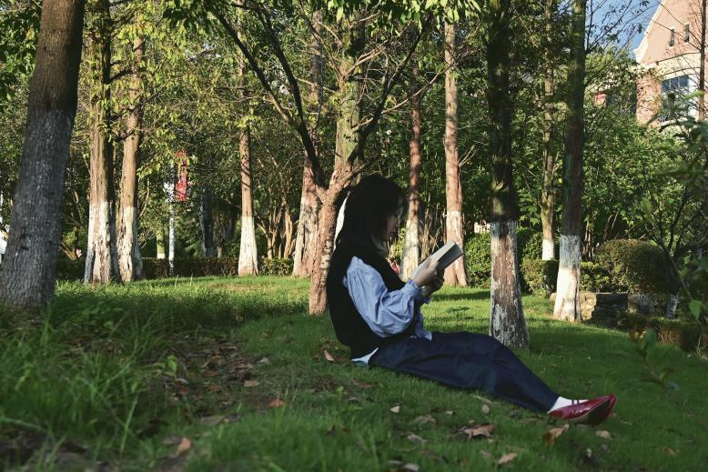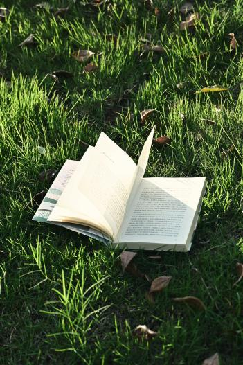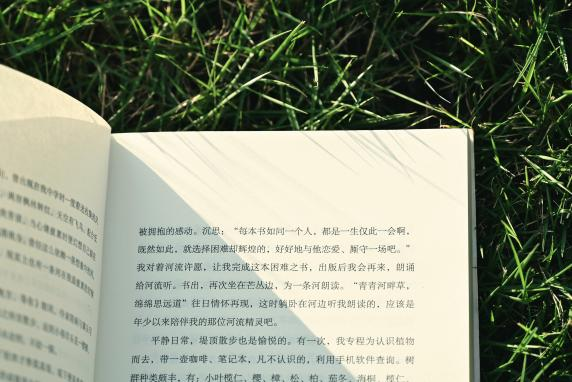 暖阳洒在我的身上,放在草地上的书被葱葱郁郁的草透过秋日傍晚的暮光,影子落在书上。看着翻动着的书,我不由得俯拍下这一幕,还平拍着书内页。暮光、绿草、落叶还有爱的书,一切都是如此纯粹。“再次坐在芒丛边,为一条河朗读”。在校园湖畔的一角,找到了我的暖光秋林,书也靠近我,鼻息间是字墨的芳香,此处是心安。