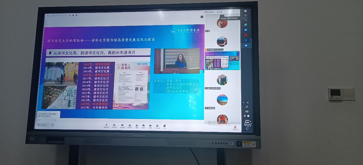 为持续提升图书馆馆员专业素养与综合业务能力,推动我馆事业高质量内涵式发展,4月9日下午图书馆全体成员在图书馆大研讨室参加“图书馆是生长的有机体——清华大学图书馆高质量发展实践与探索”的线上专题业务能力培训。此次培训由重庆市高等学校图书情报工作委员主办,重庆大学图书馆协办重庆高校图书馆馆员业务培训,培训老师是清华大学副馆长、副研究员及DRAA副理事长的张秋博士。