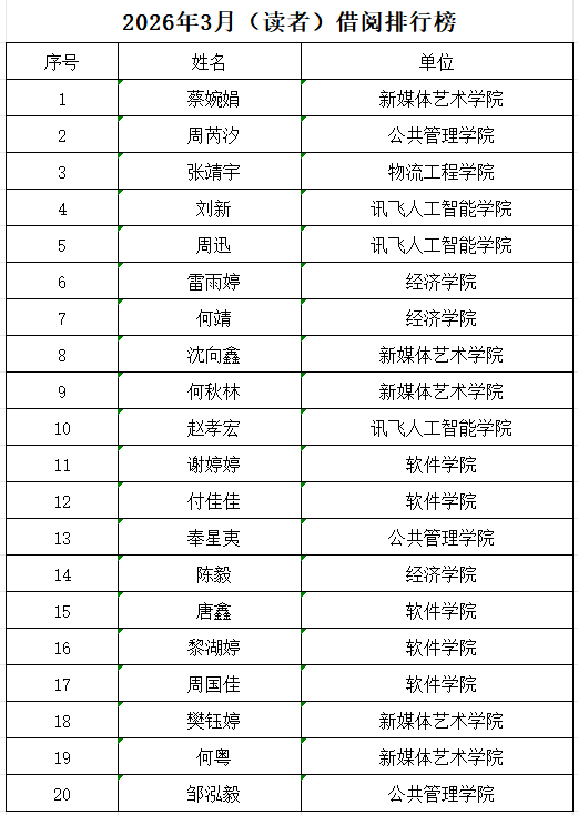 2026年3月(读者)借阅榜行榜